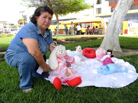 Esta mañana esta valiente mujer ha sacado a vender productos de manualidades que ella misma los confecciona para recoger dinero y contratar a un abogado que le ayude en su juicio. En un área verde de la plaza de armas de Chimbote improvisó un stand y empezó a ofertar sus trabajos.