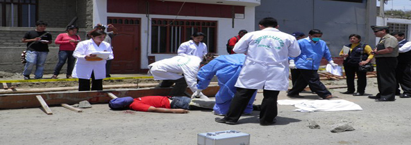 La guerra de bandas criminales por el “chalequeo” en las obras sigue provocando muertes y caos en Chimbote. Esta mañana en el pueblo joven San Pedro fue asesinado de ocho balazos Melvin Lecca Narro de 47 años “Robot”, cuando vigilaba la construcción de veredas.(Texto y fotos Lindberg Cruzado)