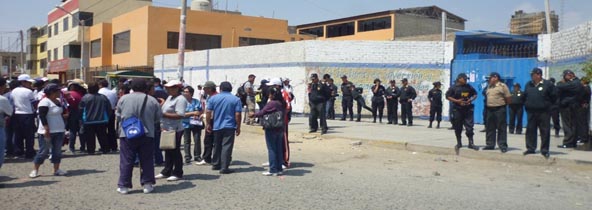 Chimbotenlinea.com (Por: Cintia Cabrera).- Cerca de dos horas, los escolares de la Institución Educativa (I.E.) “Augusto Salazar Bondy” permanecieron retenidos en el interior del plantel ante el temor de ser víctimas de los maestros huelguistas que se encontraban en el exterior del plantel y esperaban la salida de los profesores denominados “amarillos” por ambas puertas de ingreso.