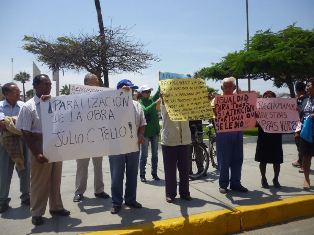 Luego de haber reclamado por las irregularidades en la construcción del colegio Julio C. Tello, los moradores de la urbanización 21 de Abril se acercaron a la Municipalidad Provincial del Santa con pancartas en mano exigiendo al alcalde provincial Luis Arroyo Rojas poner atención en la demolición del la institución educativa, de lo contrario paralizarán la obra.