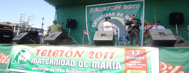 Chimbotenlinea.com (Por Nora García).-En un ambiente de folclor peruano y con un sol radiante se inició la Teletón 2011 a favor del Hogar de Niños "Ángel de la Guarda" de la Maternidad de María, en la plaza de Armas. Un gran grupo de voluntarios y colaboradores de la Diócesis de Chimbote han logrado toda la logística para esta jornada solidaria y de espectáculo familiar.