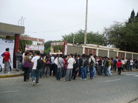 Chimbotenlinea.com (Por Cintia Cabrera).- La Federación Estudiantil de la Universidad Nacional del Santa (FUS) inició desde las 6 de la mañana de hoy una paralización de 24 horas con una plataforma encabezada por la suspensión de algunos servicios. Los estudiantes se postraron en el frontis de la primera puerta de la Casa Superior de Estudios e impidieron el ingreso de docentes y alumnos a las aulas. Incluso, no permitieron el acceso al fiscal de turno con quien quisieron protagonizar un impase.El pliego de reclamos es encabezado por el funcionamiento inmediato de los Laboratorios de Informática y Sistemas (LAI), falta mes y medio para culminar