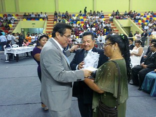 Chimbotenlinea.com (Redacción Central).- Un total de 65 parejas de contrayentes se unieron formalmente ayer viernes, a las 4:30 p.m., en el marco del II Matrimonio Civil Comunitario Masivo 2012, evento organizado por la municipalidad distrital y que tuvo lugar en el Complejo Polideportivo de “Casuarinas”, en el marco del 18° aniversario de creación política de esta importante ciudad.En esta ocasión, los padrinos fueron la regidora Rosa Neyra de Oyola y su colega Víctor Orellana, quienes expresaron sus mejores deseos a los flamantes esposos.
