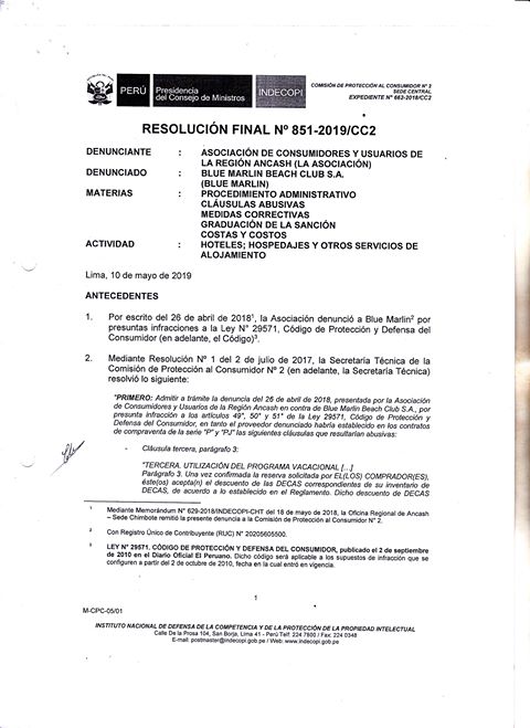 Ha pasado más de un año y la Comisión de Protección al Consumidor N.° 2 de Indecopi, mediante Resolución Final N.° 851-2019/CC2, ha declarado fundada, en primera instancia, la denuncia.