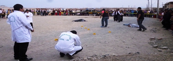 Dos presuntos chalecos fueron asesinados en el asentamiento humano “Los Constructores”, Nuevo Chimbote, de 8 disparos en la cabeza y otras partes del cuerpo. Se conoció que avezados delincuentes descendieron de un auto Toyota Yaris negro y dispararon a quemarropa contra sus víctimas. Se presume que se trate de un ajuste de cuentas. (Por: Cintia Cabrera)