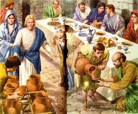 Las 6 tinajas que se usaban para el rito de la purificación, son llenadas de agua convertida en vino (vv. 6-8). Jesús es el vino nuevo porque actúa con amor. Por eso cuando llegue la hora de su pasión será la hora del servicio, del sacrificio y gloría. La transformación del agua en vino, significa la vida abundante que Jesús nos trae.