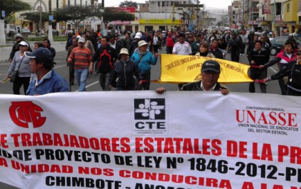 Chimbote en línea (Locales).-Los servidores públicos volvieron hoy a salir a las calles del centro de Chimbote para protestar por la aprobación del proyecto de ley del servicio civil y demandar su inconstitucionalidad.