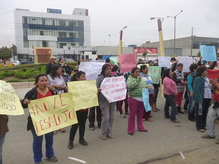 Chimbote en Línea (Locales) Con silbatos, pancartas y una gigantografía los moradores del asentamiento humano Villa España se apostaron en el frontis de la Corte Superior de Justicia del Santa, para exigir al presidente de dicha entidad y al juez Carlos Plascencia que sean justos con la resolución judicial que obliga el desalojo de 30 familias.