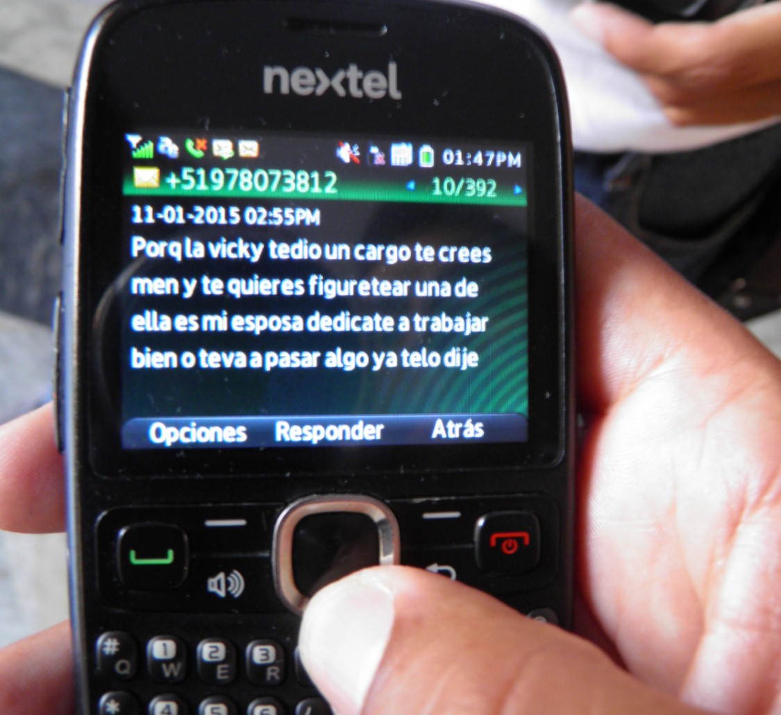 En uno de los dos mensajes de textos a través del celular número 978073812 se le amenaza: “Porque la Vicky te dio un cargo te crees men y te quieres figuretear, una de ellas es mi esposa dedícate a trabajar bien o te va pasar algo”.
