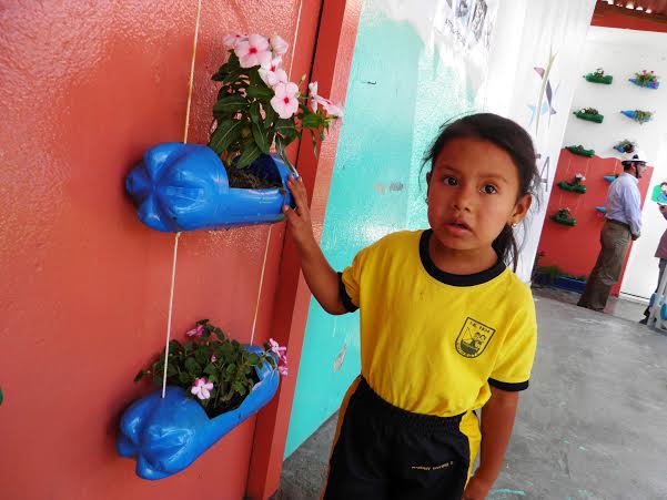 Utilizaron botellas de gaseosa descartables, las pintaron y las utilizaron como maseteros de plantas ornamentales y aromáticas para colocarlos en este centro educativo que no contaba con áreas verdes por su espacio reducido.