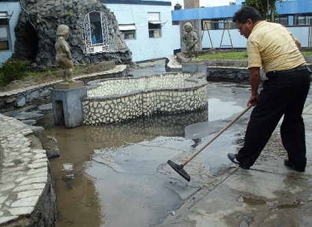 Los patios del nosocomio ni que hablar inundados, a pesar que el personal sacaba con escobas el agua empozada esta continuaba filtrándose, al igual que los pasadizos, debiendo colocar en el ingreso de los ambientes pedazos de trapos para impedir que ingrese el agua,