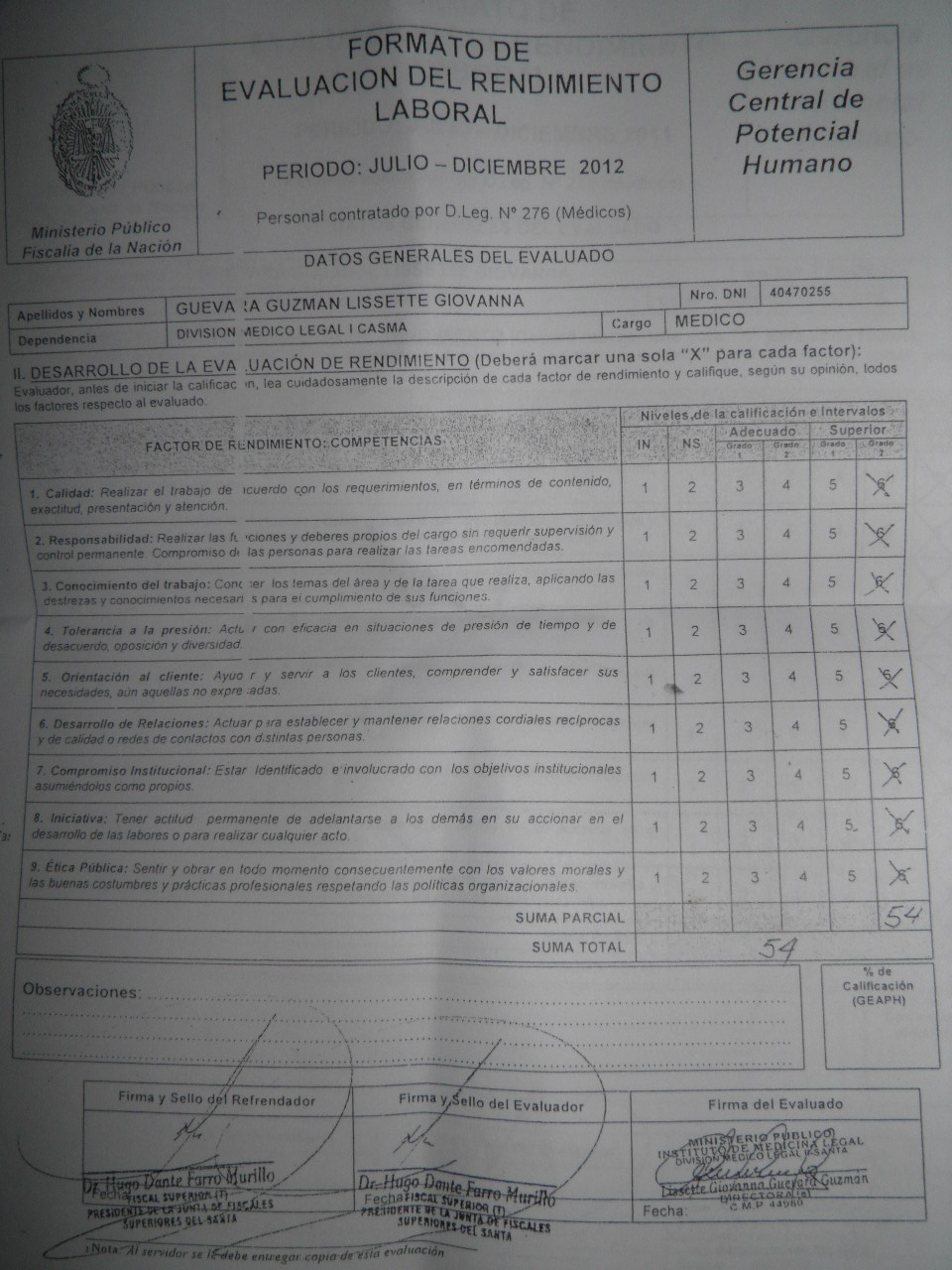 El letrado dijo que en ese entonces quien estaba al frente del Ministerio Público, era el cuestionado fiscal titular superior Dante Farro Murillo quien fue bastante considerable en su calificación que según el parámetro de puntaje del 1 al 6 le dio el más alto. “Poco le faltó colocar en sus observaciones que ella debería ser la jefa del Instituto de Medicina Legal a nivel nacional”, sostuvo.