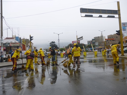 A pesar de la falta de implementos, las trabajadoras de limpieza pública, se encargaron de barrer el agua que se había empozado en