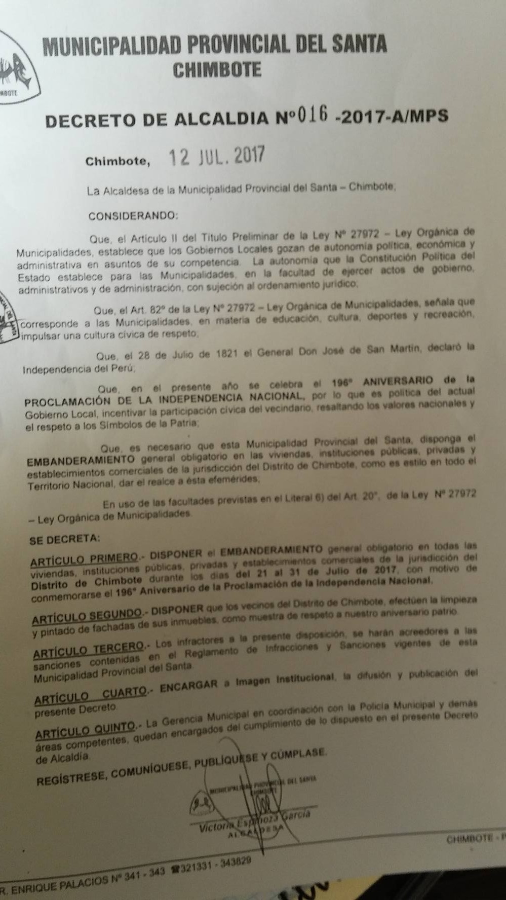 Chimbote en Línea.- Mediante Decreto de Alcaldía N°016, la Municipalidad Provincial del Santa ordenó el embanderamiento obligatorio de viviendas, instituciones públicas, privadas y establecimientos comerciales desde el 21 al 31 de julio, por Fiestas Patrias.
