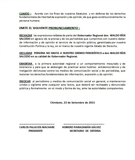 Asimismo a través de un pronunciamiento el Centro Federado de Periodistas de Chimbote rechaza las expresiones de la autoridad ancashina y declara persona no grata a su gremio periodístico a Waldo Ríos Salcedo en su calidad de gobernador regional. También lo exhorta a asumir un comportamiento mesurado y de tolerancia.