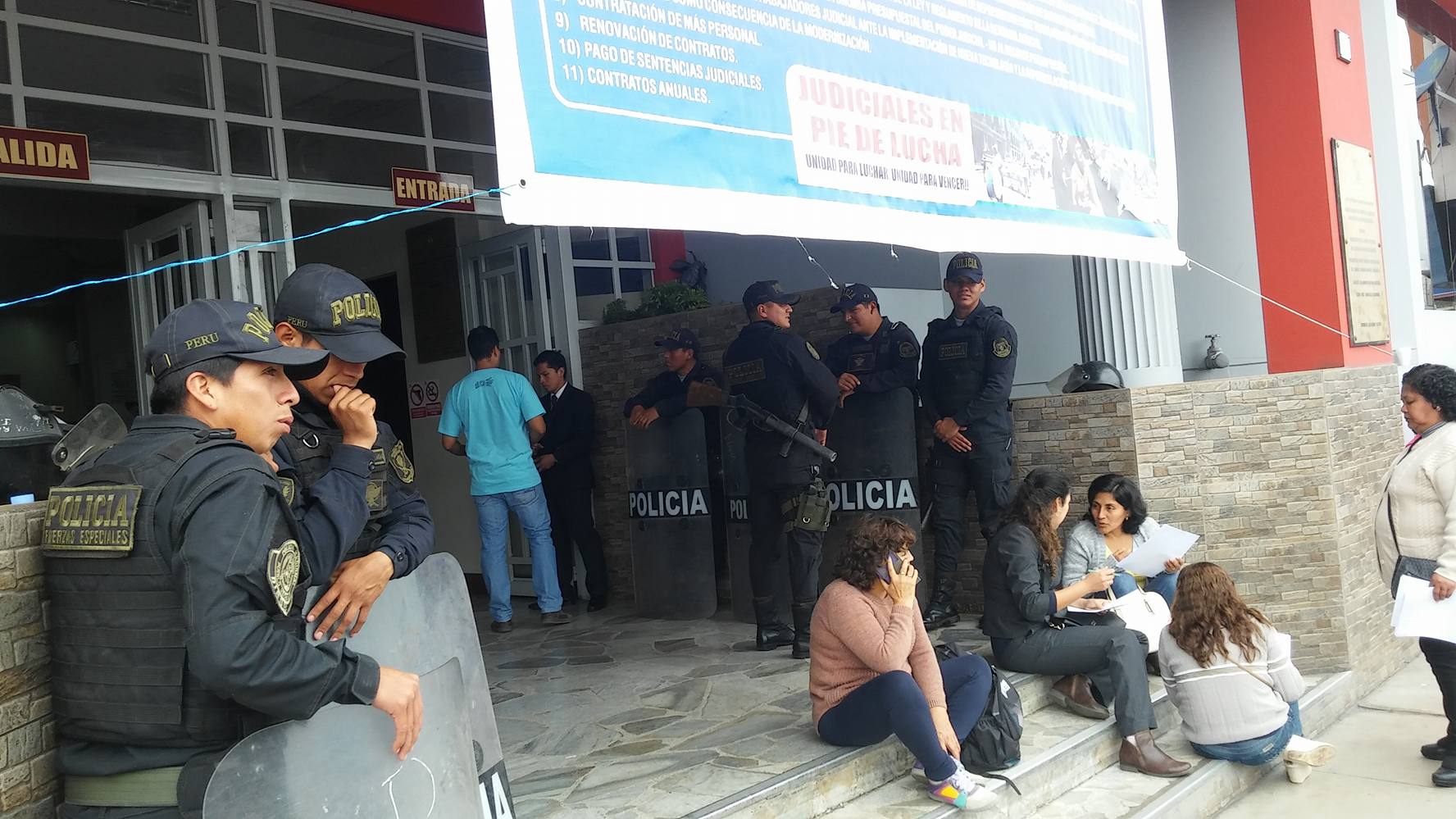 Los servidores se apostaron en la puerta de ingreso de la sede judicial y esta vez dejaban ingresar a las personas que buscaban ser atendidas, en tanto un fuerte contingente policial resguardaba el libre acceso.