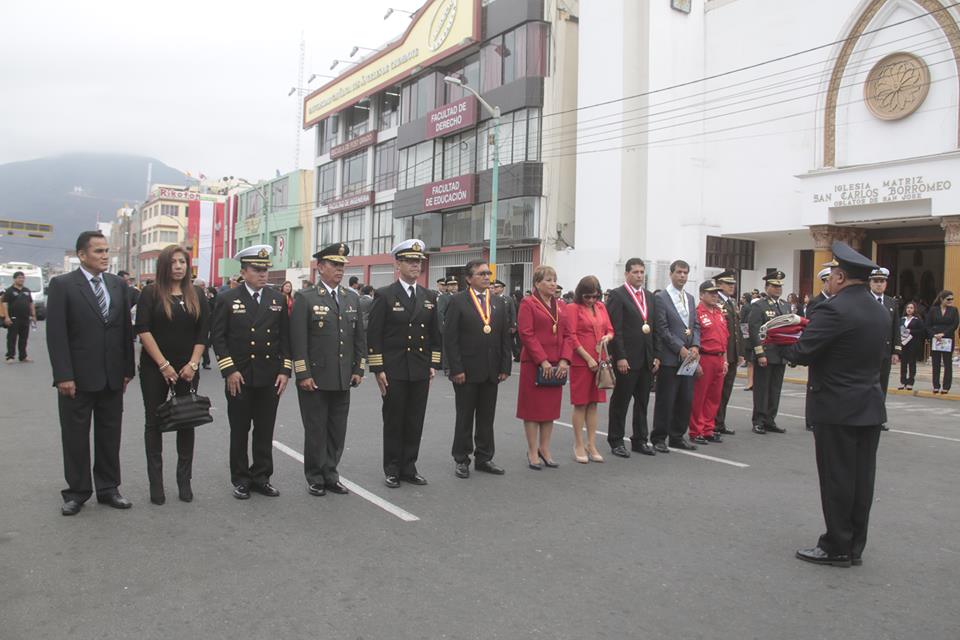 A primeras horas de la mañana las autoridades participaron de la misa Te Deum en la iglesia matriz San Carlos Borromeo y luego se desplazaron -portando una inmensa bandera- hasta la tribuna de honor, a fin de presenciar el desfile cívico-militar que se desarrolló en la Plaza de Armas de Chimbote.
