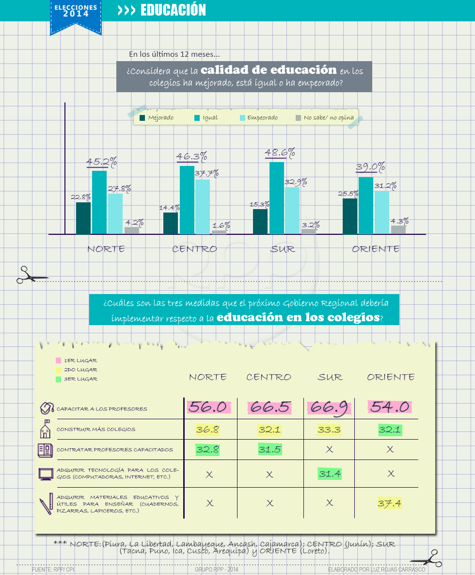 A la pregunta ¿Cuáles son las tres medidas que el próximo gobierno regional debería implementar respecto a la educación en los colegios? El 60,6% señala que se debe capacitar a los profesores, el 34,9% dice que se deben construir más colegios y el 31,8% contratar profesores más capacitados