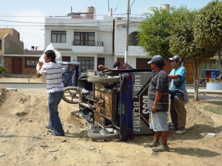 Hoy, al promediar la 1 de la tarde, Luis Fernández Pérez de placa A7 8825 transportaba a su pasajero Luis Ramírez Reyes, un comerciante que lleva un saco de maíz hacia su vivienda, cuando de repente la unidad en que se desplazaban se volcó al tratar de pasar un elevado montículo de tierra.