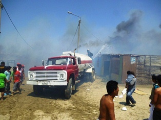 Chimbote en Línea (Nuevo Chimbote).- Un incendio de gran magnitud consumió en contados minutos 26 ranchos de las manzanas G y E del asentamiento humano Los Conquistadores II etapa, en Nuevo Chimbote. El siniestro se inició minutos antes de la 11 de mañana en la manzana G-13, lugar donde había varios kilos de carbón y se encontraba un niño de un año, quien resultó con quemaduras de primer grado en uno de sus brazos. (Fotos Liliana Capuñay )