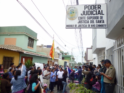 Con pancartas y muy iracundos, los moradores de los asentamientos humanos “Víctor Haya de la Torre” y “Luis Alberto Sánchez” protestaron en el frontis de la Oficina del Juzgado Liquidador de Nuevo Chimbote; exigiendo la presencia del juez Edward García Marín, quien ayer fue a la zona de conflicto. Ellos anuncian atrincheramiento para evitar desalojo y buscan una conciliación a precio justo.
