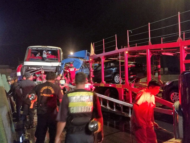 El chofer del tráiler perdió el control de su vehículo producto de la fuerte lluvia a la altura del puente José Gálvez. Agentes de Seguridad Ciudadana y bomberos de Chimbote rescataron con equipos oxicorte a los heridos que quedaron atrapados entre los fierros retorcidos.