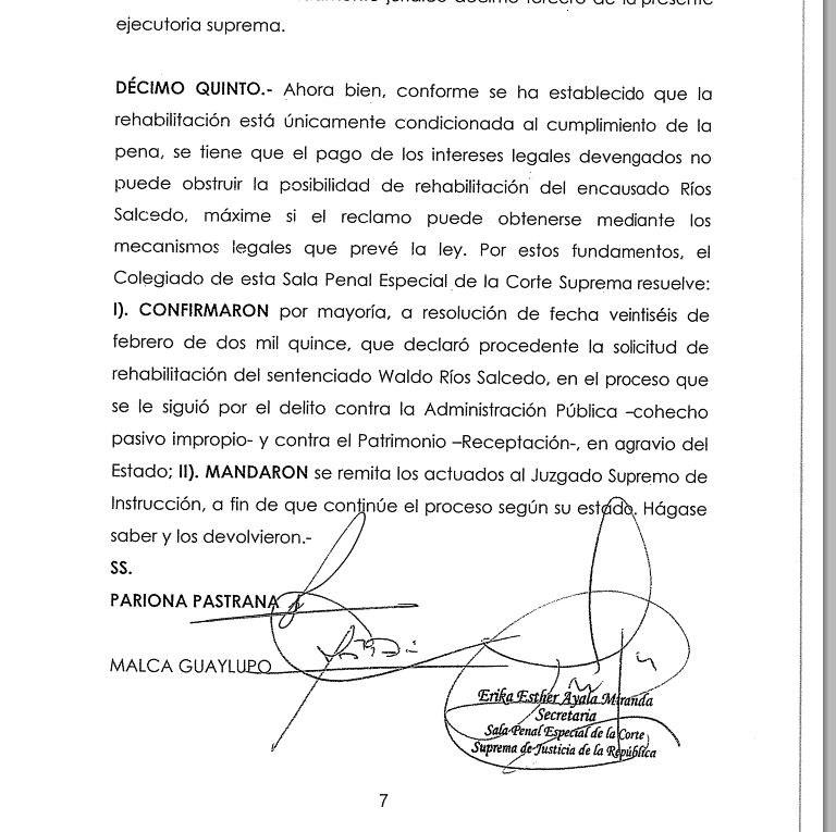 La resolución favorable a Ríos Salcedo está rubricada por los magistrados Josué Pariona Pastrana y Víctor Malca Guaylupo.  En tanto el juez supremo Víctor Prado Saldarriaga, presidente de la sala, se pronunció por la improcedencia de la rehabilitación, en tanto no cumpla con pagar el monto que corresponde a los intereses devengados. (Redacción central)