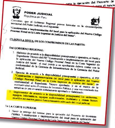 ¿Para qué sirvieron esos convenios? Dieron“luz verde” para que el Gobierno Regional desembolse un monto indeterminado de dinero (no se fijó la cantidad, pero fue más de S/.15 millones) para la construcción y el equipamiento de la Corte Superior de Justicia del Santa así como para la compra de cuatro camionetas para el traslado de los jueces.
