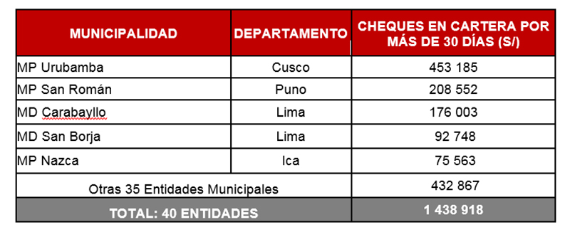 En 40 entidades municipales se encontraron cheques girados con una antigüedad mayor de 30 días, por S/ 1 438 918, situación que evidenciaría principalmente el no pago oportuno a los proveedores dándole poder de negociación a los funcionarios del municipio, así como la falta de documentación para sustentar el giro de los mismos, incumpliéndose la normativa vigente. Los hechos observados en el 14.9% de las municipalidades visitadas genera el riesgo de que en determinadas municipalidades se estén estableciendo mecanismos informales para pagar a proveedores y otros.