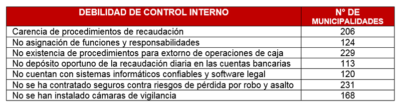 Durante el operativo desplegado a 265 municipalidades provinciales y distritales del país así como a 4 Servicios de Administración Tributaria (SAT), se advirtieron hechos que podrían ocasionar que los fondos municipales estén en peligro de pérdida, sustracción, apropiación y/o uso indebido distinto a los fines establecidos, establecimiento de mecanismos informales de pago a proveedores y otros sin que sean identificados en su oportunidad.