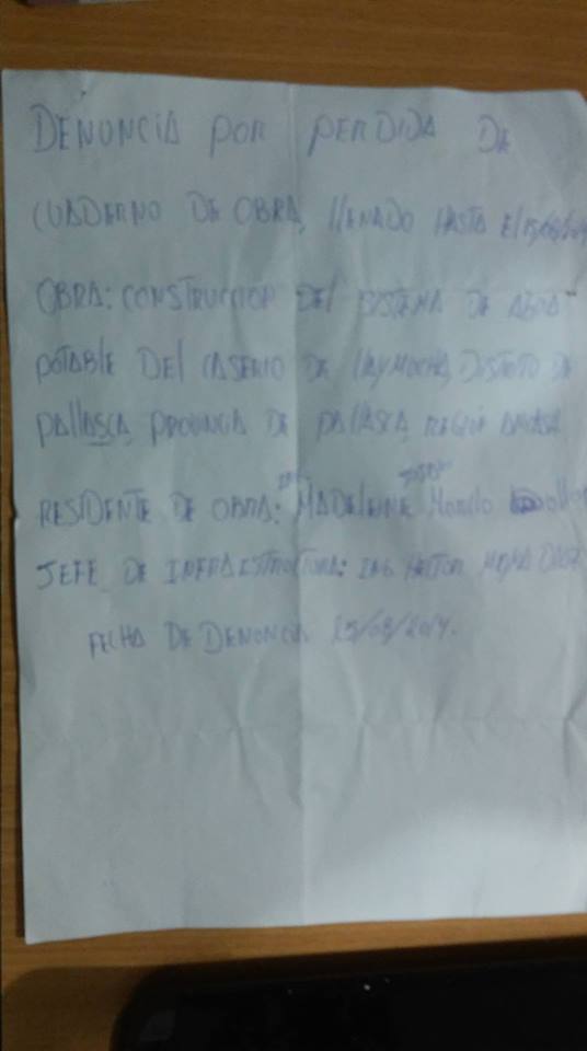 En ese sentido, señaló que pidió a la Municipalidad de Pallasca el cuaderno de obra; sin embargo el alcalde y su gerente municipal Braider Díaz informaron que dicho cuaderno fue robado y que asentaron la denuncia en la comisaría.