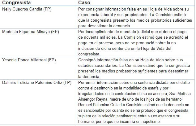 Varios casos quedaron fuera en esta etapa del proceso. Uno de los más conocidos fue la segunda denuncia contra la congresista de las filas de Fuerza Popular representante de Áncash,  Yesenia Ponce por declarar información falsa en su Hoja de Vida. La Comisión decidió que el hecho no ameritaba sanción.