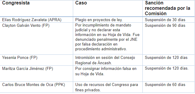 En el caso del parlamentario aprista, Elías Rodríguez Zavaleta,  representante de La Libertad, quien fue investigado por plagio de proyectos de ley, la Comisión de Ética recomendó sólo una suspensión en funciones de 30 días.