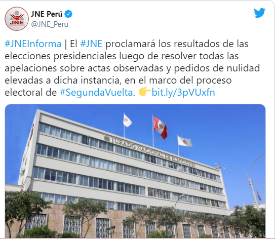 “El JNE proclamará los resultados de las elecciones presidenciales luego de resolver todas las apelaciones sobre actas observadas y pedidos de nulidad elevadas a dicha instancia, en el marco del proceso electoral de segunda vuelta”, informó la autoridad electoral a través de un comunicado en sus redes sociales.