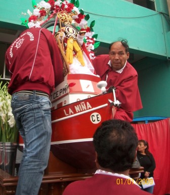 Chimbote en línea (Cuestión  de Fe).- Esta tarde inició la fiesta San Pedrito, patrono de Chimbote, con un homenaje  por la Capitanía del Puerto y luego la colocación de Santo patrón de los pescadores en su anda por el Capitán Renzo Robisso Oblitas, hermandad  y el coordinador de la actividades religiosas, Fray Héctor Herrera o.p., en el Sindicato de Pescadores.