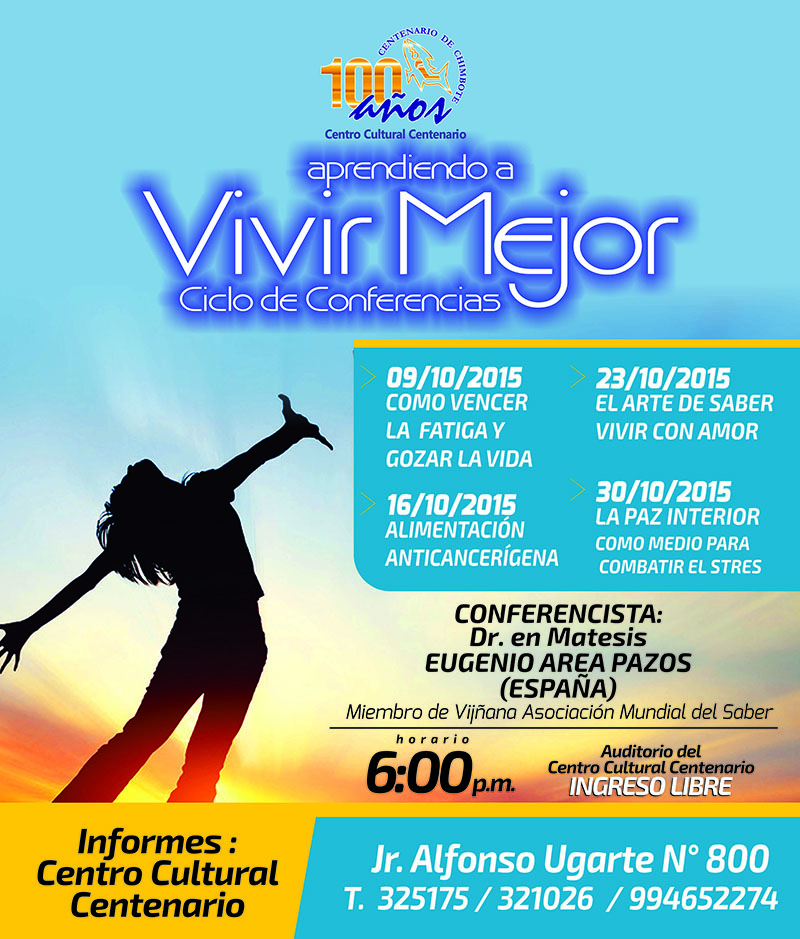 Chimbote en Línea.- Hoy inician el ciclo de conferencias “Aprendiendo a vivir mejor”, que organiza el Centro Cultural Centenario, a cargo del doctor en Mathesis, Eugenio Area Pazos; con la finalidad de que aprendamos a hacer foco en las soluciones de los problemas y combatir el estrés.