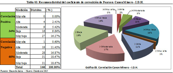 La correlación distrital entre canon minero e I.D.H es baja (débil) alcanzando apenas 0.3284 , de los 166 distritos el 66% tiene un indicador de correlación negativa entre canon minero e I.D.H.  Y si aislamos los de muy baja correlación, solamente el 18% de distritos presentan correlación positiva; por lo tanto los los presupuestos públicos provenientes del canon minero no han sido el factor que haya contribuido en la mejora y evolución de sus I.D.H.