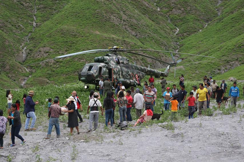 Una cadena humana fue formada por las autoridades junto a los pobladores de San Miguel, para trasladar las donaciones desde el helicóptero hacia su sede municipal. Horas más tarde, la ayuda se trasladó hasta el distrito de Malvas, donde una gestante requería urgente traslado por presentar embarazo riesgoso.(NP)