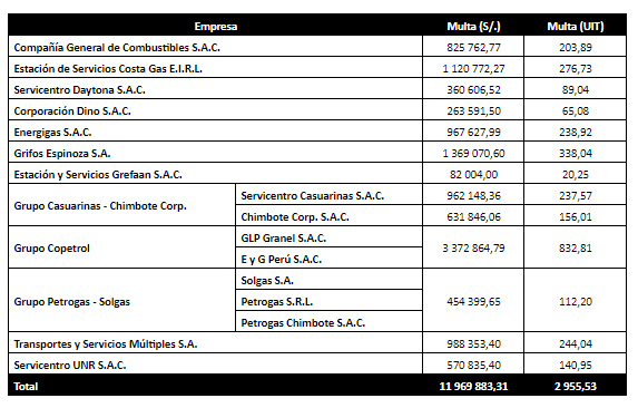 Así, Indecopi sancionó con más de 11 millones de soles, en primera instancia, a 16 empresas: Chimbote Corp. S.A.C., Servicentro Casuarinas S.A.C., Servicentro UNR S.A.C., Grifos Espinoza S.A., Corporación Dino S.A.C., Energigas S.A.C., Estación y Servicios Grefaan S.A.C., Compañía General de Combustibles S.A.C., E y G Perú S.A.C., GLP Granel S.A.C., Solgas S.A., Petrogas S.R.L., Petrogas Chimbote S.A.C., Transportes y Servicios Múltiples S.A., Estación de Servicios Costa Gas E.I.R.L. y Servicentro Daytona S.A.C.