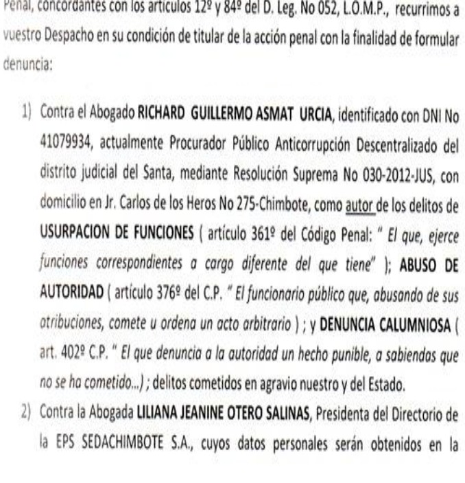 Chimbote en Línea.- El titular de la Procuraduría Anticorrupción del Santa, Richard Asmat Urcia fue denunciado por los presuntos delitos de usurpación de funciones, abuso de autoridad y denuncia calumniosa, tras haber promovido una acción penal ante el Ministerio Público por un supuesto nombramiento ilegal del gerente y la integrante del directorio de Sedachimbote.