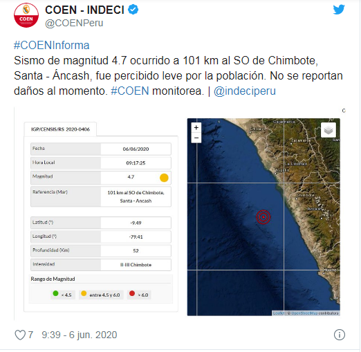 Según el reporte del IGP el temblor, ocurrido a las 09:17 horas, tuvo como epicentro a 101 kilómetros al suroeste de la ciudad de Chimbote, con una profundidad de 52 kilómetros y se sintió con una intensidad II-III en Chimbote.