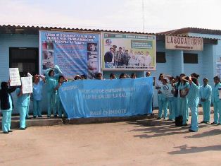 Chimbote en Línea (Locales).-Esta mañana las enfermeras del hospital La Caleta realizaron un plantón exigiendo el respeto a la Resolución Ministerial Nº 136 – 2012- Minsa, donde menciona que cada trabajador debe cumplir con la jornada legal de trabajo en 25 turnos, que serían 150 horas mensuales.