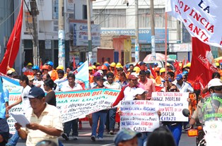 Chimbote en Línea (Locales). Un centenar de chimbotanos se movilizaron con carteles y gigantografías por las principales calles de Chimbote, convocados por el Frente de Defensa de la Provincia del Santa, para exigir que el Gobierno Central atienda sus 9 pedidos.