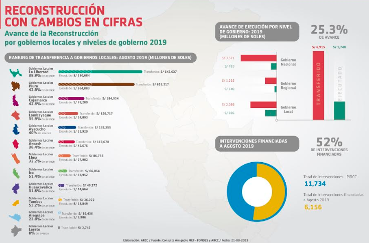 Chui Mejía explicó que las transferencias se han efectuado progresivamente entre 2017-2019 y uno de los aspectos más relevantes del proceso ha sido el desempeño de los Gobiernos Locales que han asumido el liderazgo de la Reconstrucción. Indicó que solo en el presente año la ARCC ha culminado el cambio de unidad ejecutora de 1,876 intervenciones en favor de las municipalidades provinciales y distritales más eficientes en la ejecución de sus presupuestos.