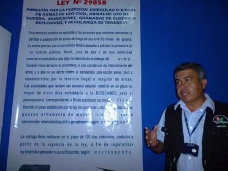 Esta ley 29858 fue promulgada el 3 de mayo y contempla 120 días para que estas personas que poseen armas de manera ilegal puedan devolverlas. Estas personas están acogidas en el anonimato mientras dure esta amnistía. Las armas que se encuentran al margen de la ley es un 30% aproximadamente que equivale a 280 personas que incurrirían en el delito de tenencia ilegal de armas.