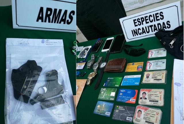 Mientras que su acompañante Cleyder Stalin Chunga Quispe de 21 conducía un automóvil Nissan de placa de rodaje T1T-447. Además, se les incautó cinco licencias para portar armas de fuego con diferentes nombres, tres celulares, cinco relojes pulsera y siete tarjetas de diferentes bancos.