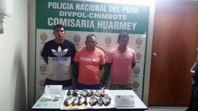 Luis Miguel Pineda Aparcana de 28 años, Raúl Eugenio Cochachín García de 45 y Cristhian Eduardo Campos Bravo de 34, quienes tenían en su poder 20 kilos de pescados, así como explosivos, fulminantes y mechas.