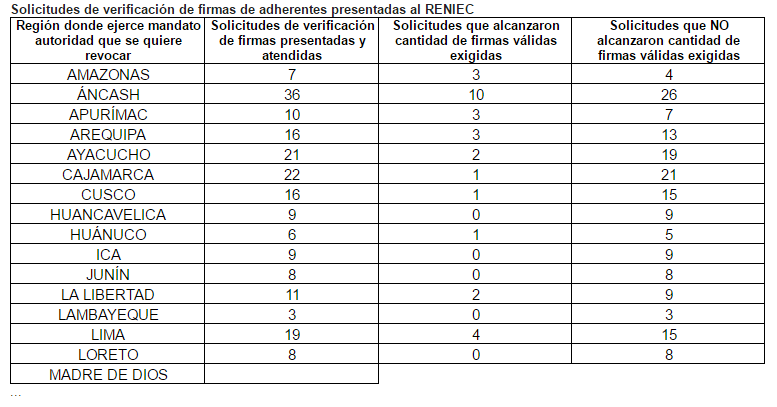 Según lo establecido por la legislación peruana y el Jurado Nacional de Elecciones (JNE), el mínimo de firmas válidas necesario para que sea atendida una solicitud de revocatoria equivale al 25 % de electores que, según su Documento Nacional de Identidad (DNI), residen en la misma jurisdicción electoral de la autoridad que quieren revocar. De los 32 expedientes que cumplieron este requisito, todos se refieren a autoridades distritales y el mayor número se encuentra en las regiones de Áncash (10) y Lima (Zuñiga en Cañete; Lincha, Madean y San Joaquín en Yauyos).