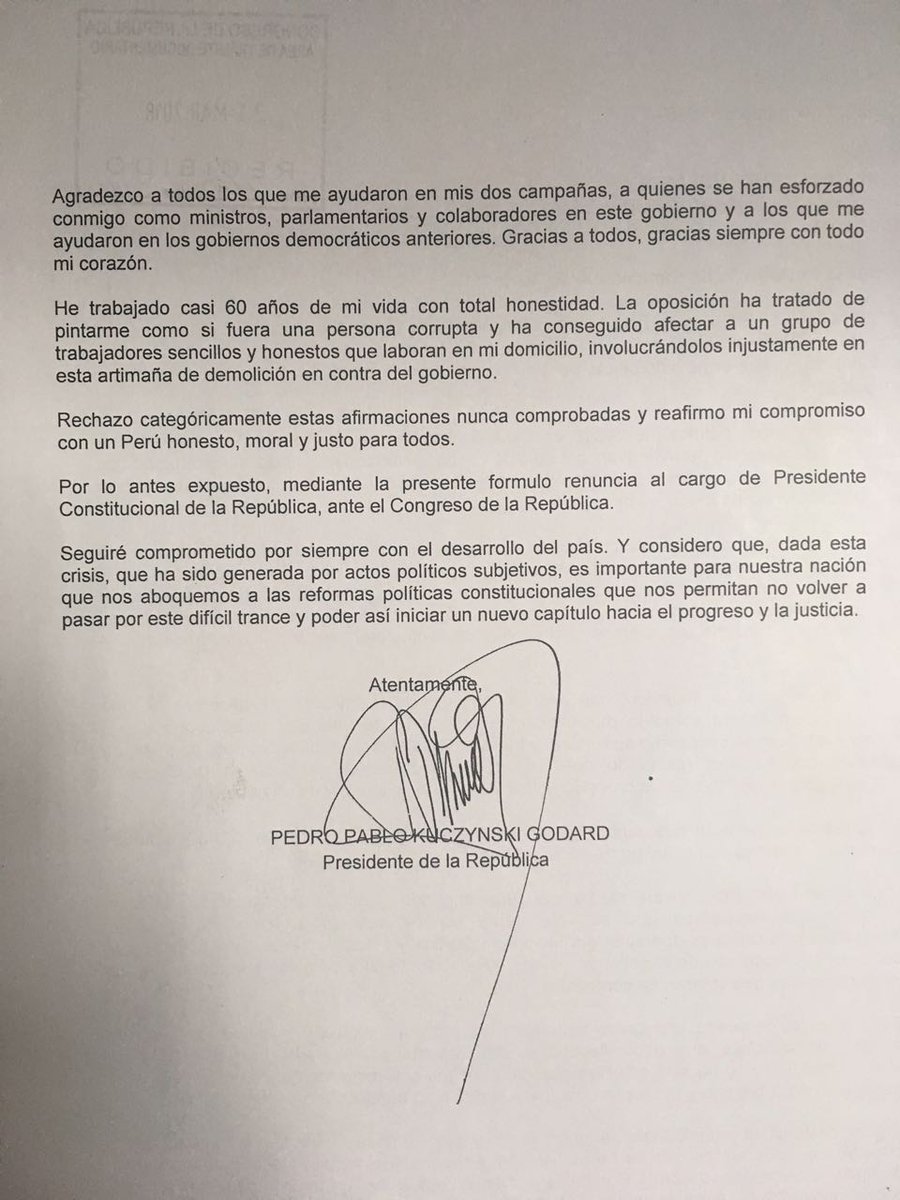 Kuczynski hizo oficial, a través de un mensaje a la nación, su renuncia al sillón de Pizarro, lucía muy afectado por la crisis política que vive el país y enfatizó en todo momento que no ha sido partícipe de actos de corrupción. Junto a sus ministros de Estado, dijo que gobernó a pesar de las constantes obstaculizaciones y ataques de una mayoría en el Congreso, situación que aceleró un clima de ingobernabilidad que le hace daño al país y no permite avanzar.