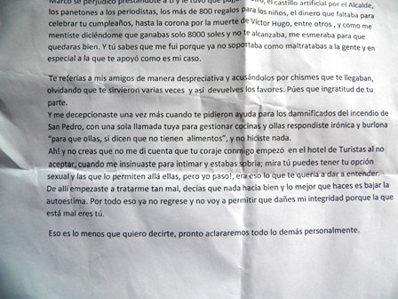 Galarza Vidal confirmó la veracidad de un mensaje electrónico que envío a su exjefa Nena Escalante y que fue filtrado a la prensa. En este email enviado el pasado 17 de mayo al correo descalante@minister.gob.pe escribe que la nacionalista pidió apoyo económico a dos ingenieros constructores de apellido Carretero y Oliveros para regalar juguetes a 800 niños, panetones a periodistas y hasta para celebrar su cumpleaños.